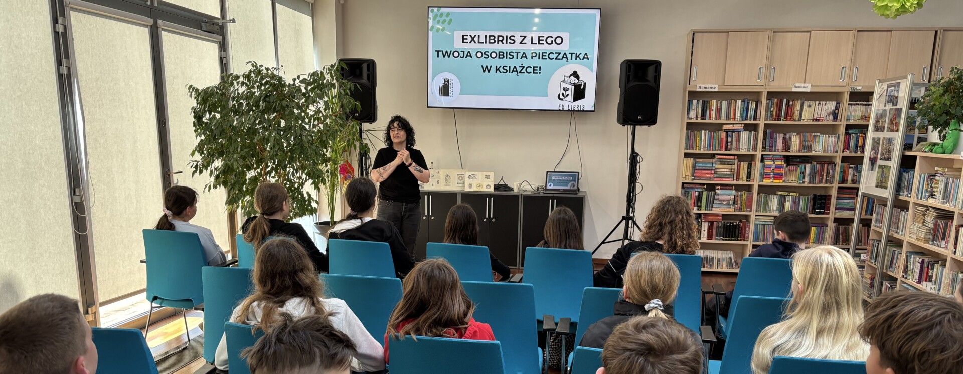 Pani Zuzanna poprowadziła warsztaty z tworzenia spersonalizowanej pieczątki exlibris, z wykorzystaniem klocków LEGO.