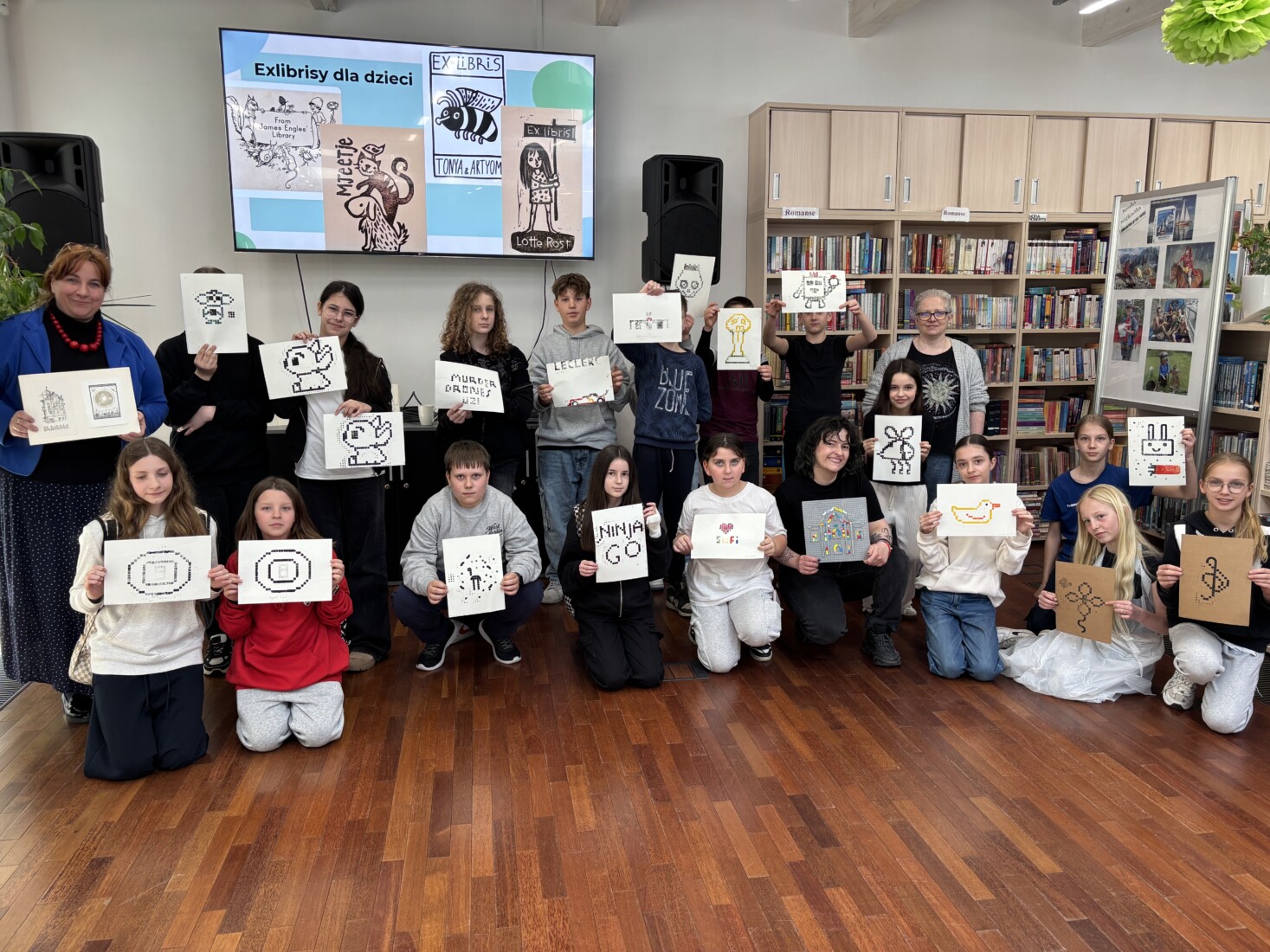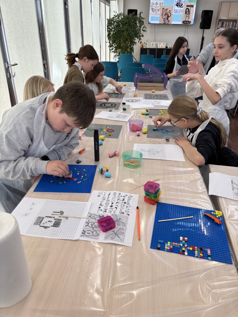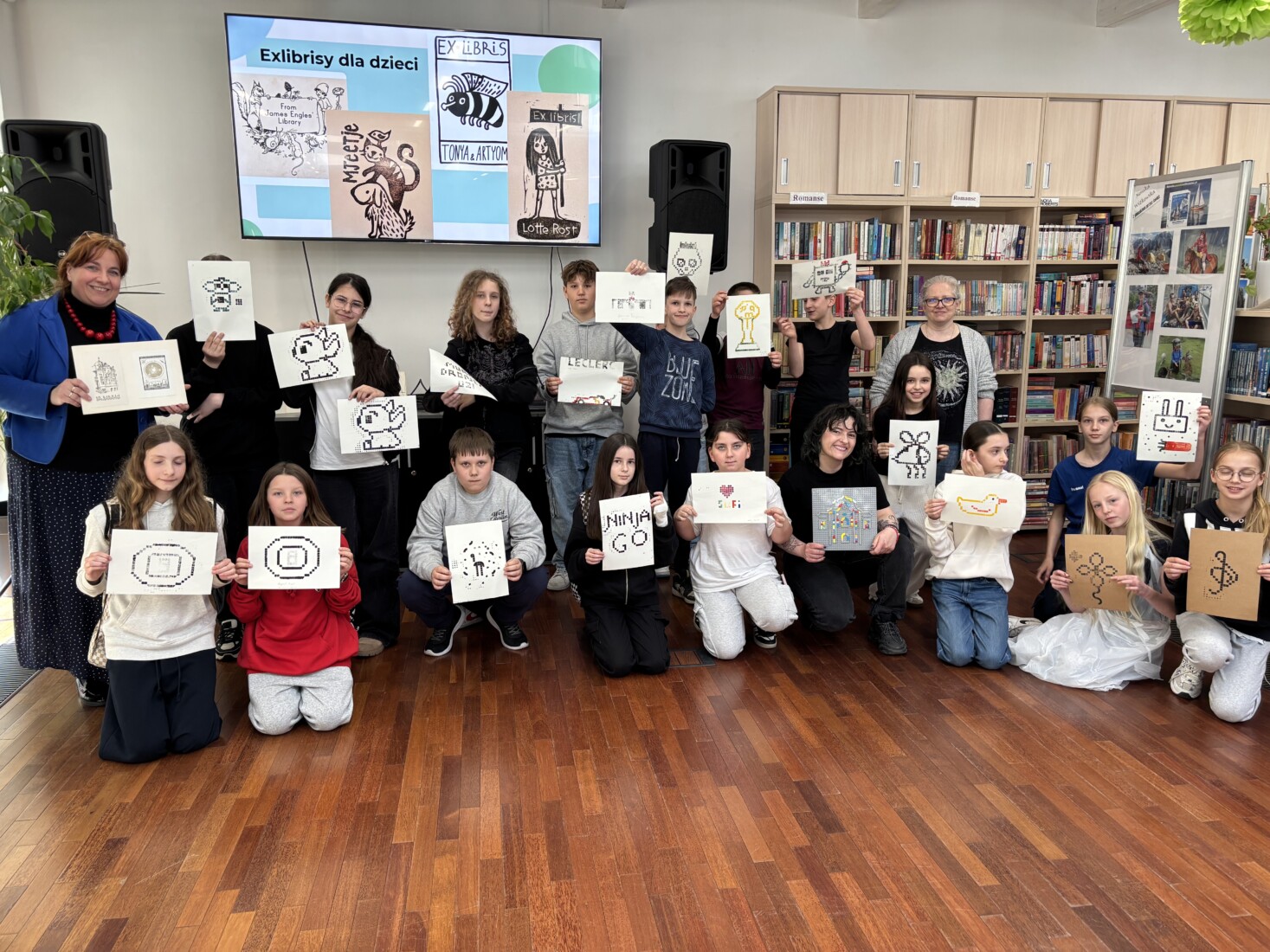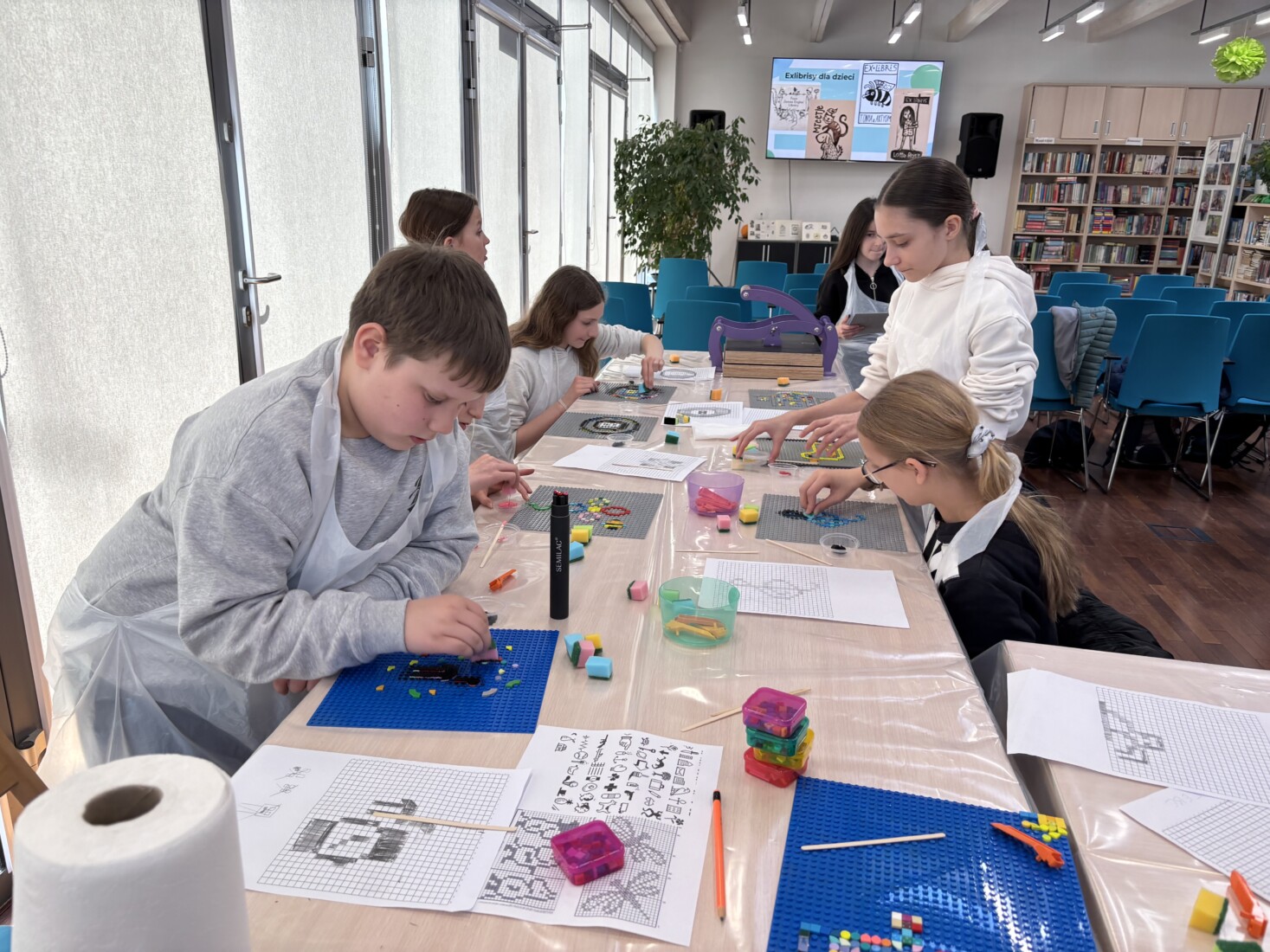 Zajęcia rozpoczęła krótka prezentacja, z której uczniowie dowiedzieli się czym w ogóle jest exlibris oraz poznali jego historię, a następnie wykonali projekt własnej pieczątki z klocków LEGO i odbili go na specjalnej matrycy.