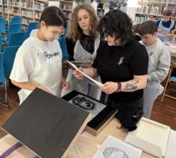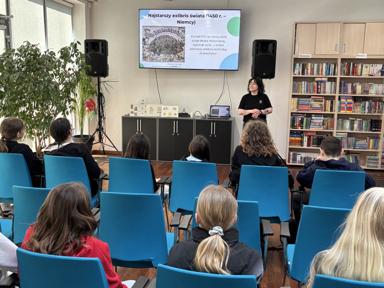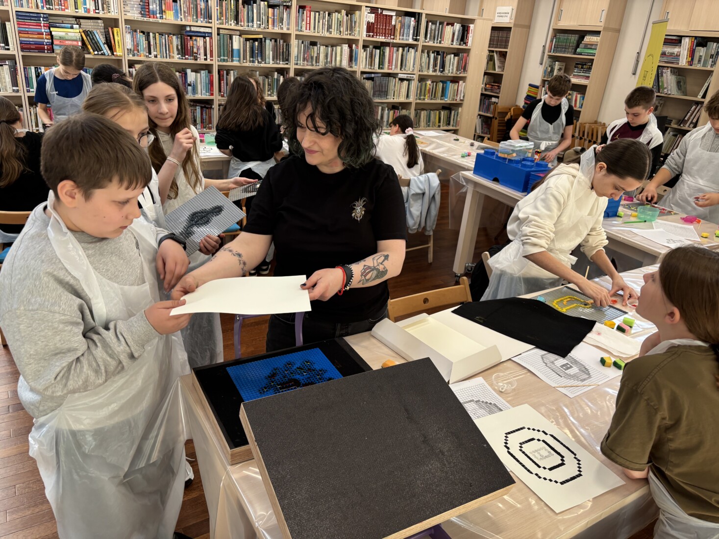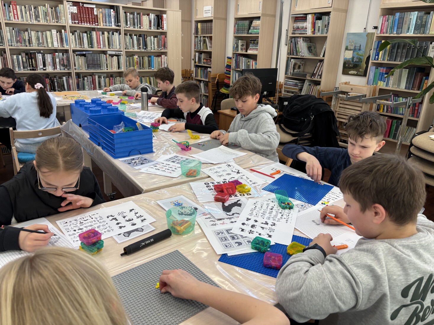 Zajęcia rozpoczęła krótka prezentacja, z której uczniowie dowiedzieli się czym w ogóle jest exlibris oraz poznali jego historię, a następnie wykonali projekt własnej pieczątki z klocków LEGO i odbili go na specjalnej matrycy.